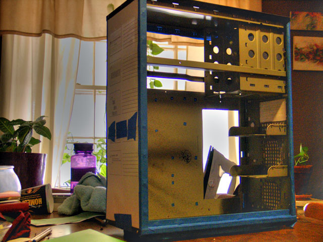 The interior is getting coated with a rubberized sound-deadening spray primer. In my previous build for this case I'd done the inside of the doors (the black crap in previous photos) and was happy with the result. However, on air cooling the temperature increase was pretty bad (~4°C on a P4C); so I held off on painting the entire interior.