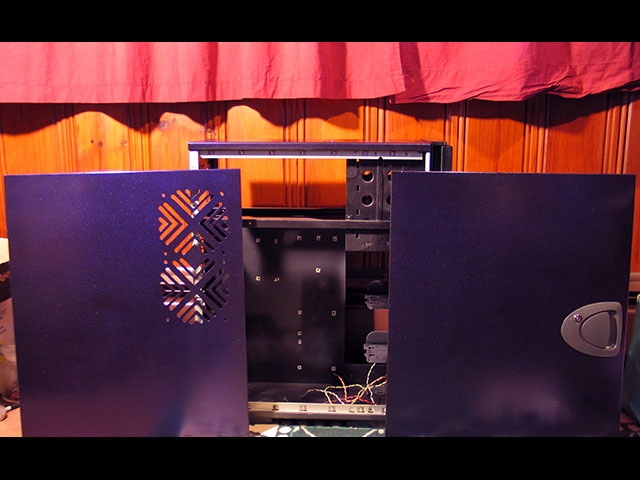 Many coats of primer, metallic color shifting paint (depending on the angle or the light it looks blue, purple, or red), and clear-coat later.